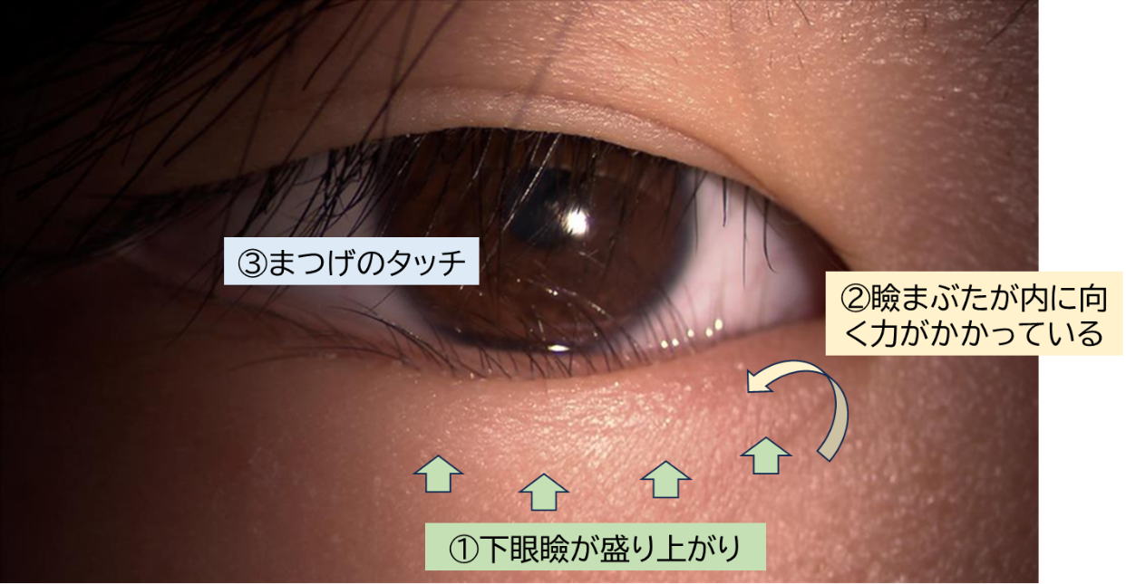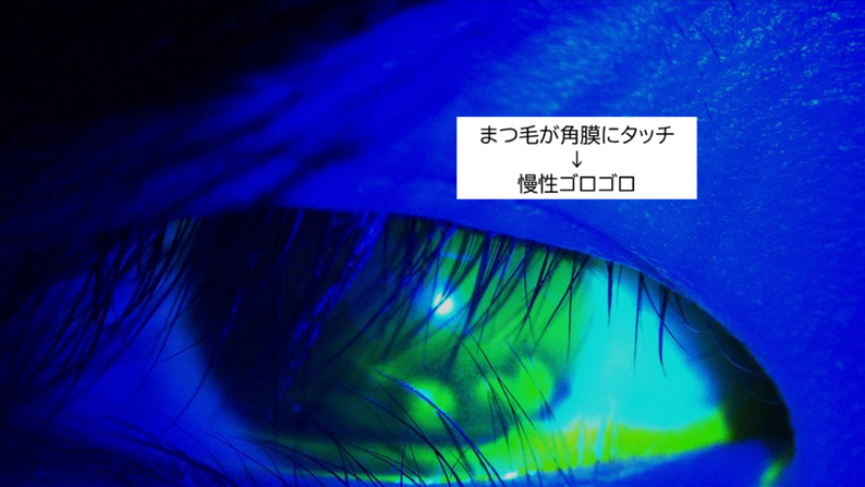 まつ毛が角膜(黒目)や結膜にこすれることで、痛みや違和感、充血、涙目、慢性眼脂などの症状が出ます。