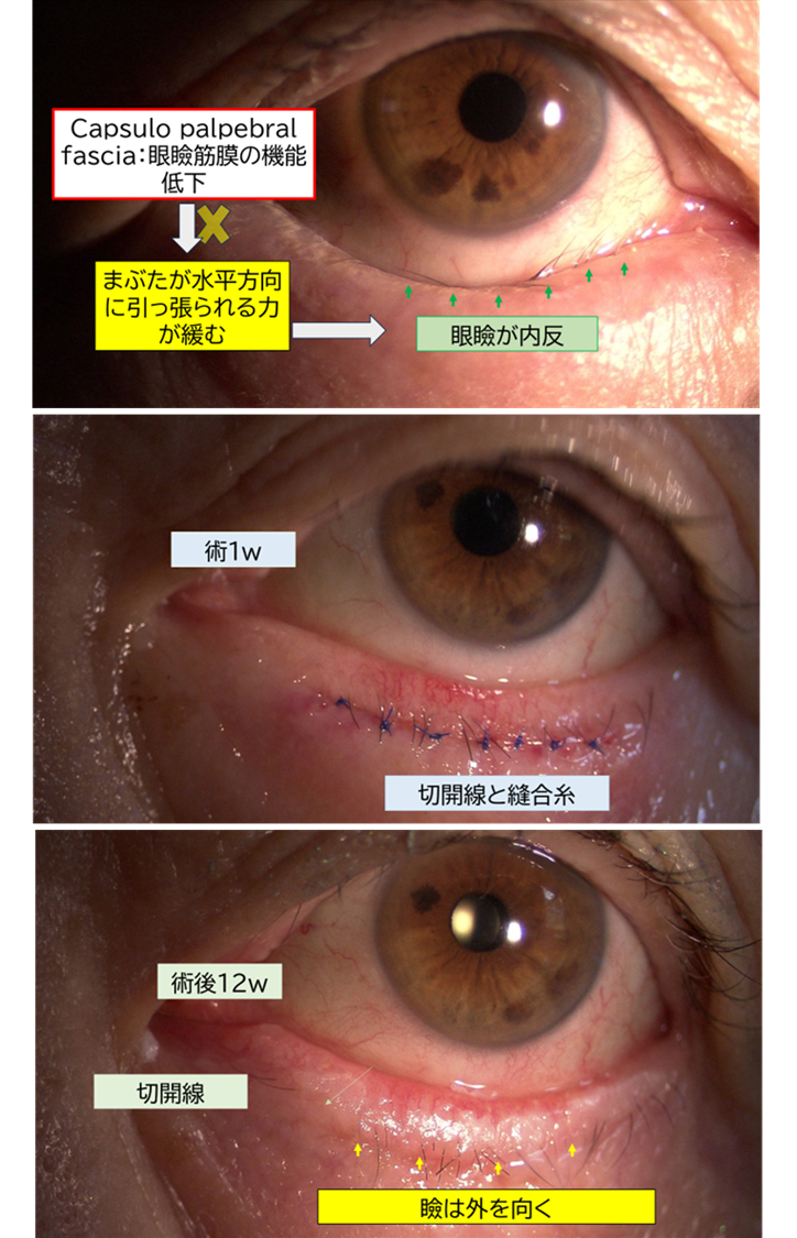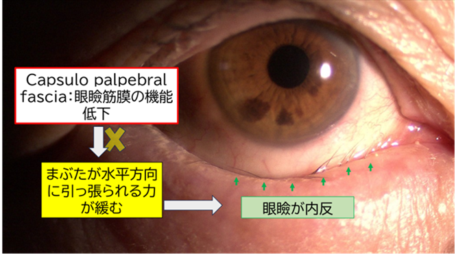 加齢とともにまぶたの筋肉や皮膚がゆるみ、下まぶたが内側にめくれてしまいます。