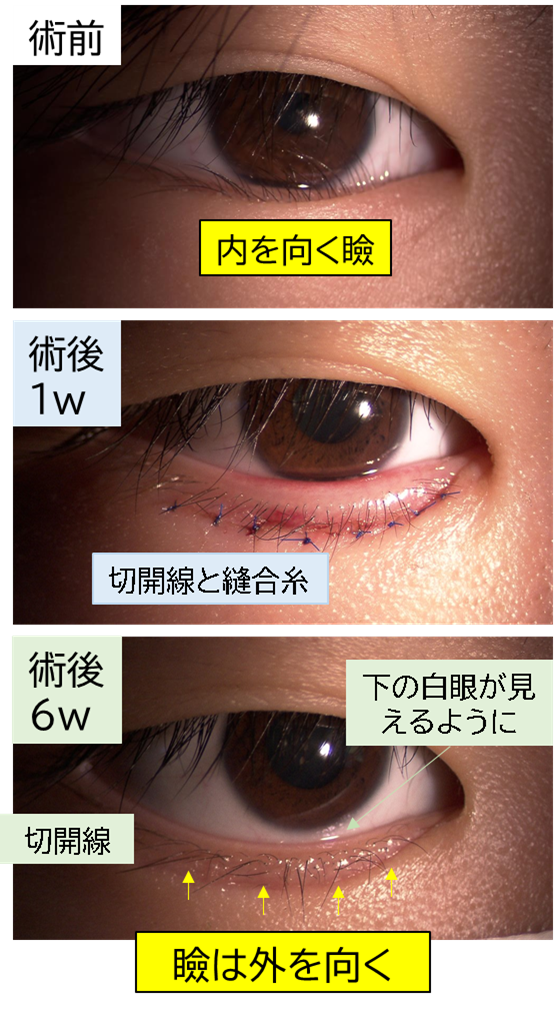 保存療法には人工涙液や抗炎症薬の点眼にて目の「きず」や炎症を緩和、またまつげの抜去はもちろん一時的な症状改善に有効ですが、必ず再発するため、根本的な治療にはなりません。