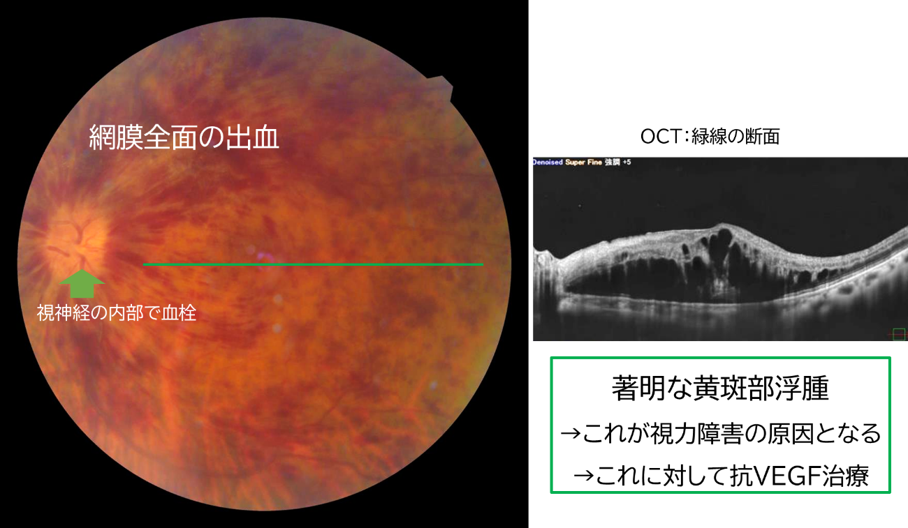 網膜のすべての静脈が集まる網膜中心静脈が詰まるタイプです。